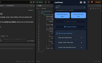 นอกจากนี้ LeetParse ยังมีฟังก์ชันการดึงกรณีทดสอบและผลลัพธ์ที่คาดหวัง ทำให้การตรวจสอบความถูกต้องของวิธีแก้ปัญหาง่ายขึ้น มันทำงานร่วมกับส่วนขยาย CPH ได้อย่างราบรื่น ทำให้สามารถส่งออกโค้ดไปยัง Visual Studio Code ได้โดยตรง ความเข้ากันได้ที่ราบรื่นนี้ทำให้มั่นใจได้ว่านักพัฒนาสามารถรักษากระบวนการทำงานของตนได้โดยไม่มีการหยุดชะงัก ทำให้ LeetParse เป็นส่วนเสริมที่มีค่าสำหรับผู้ที่มีส่วนร่วมในการเขียนโปรแกรมเชิงแข่งขัน